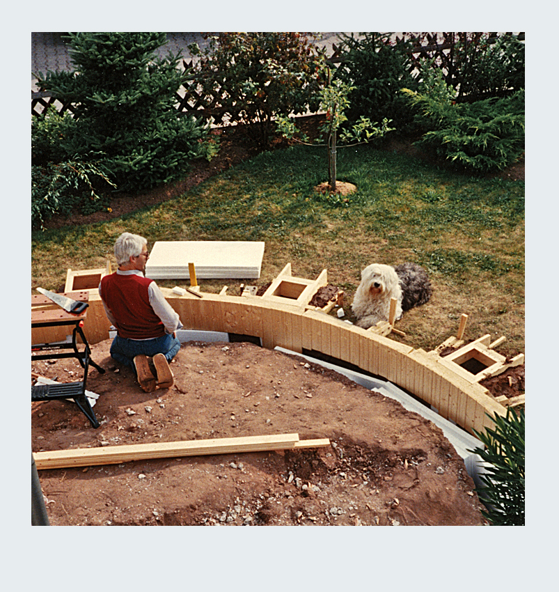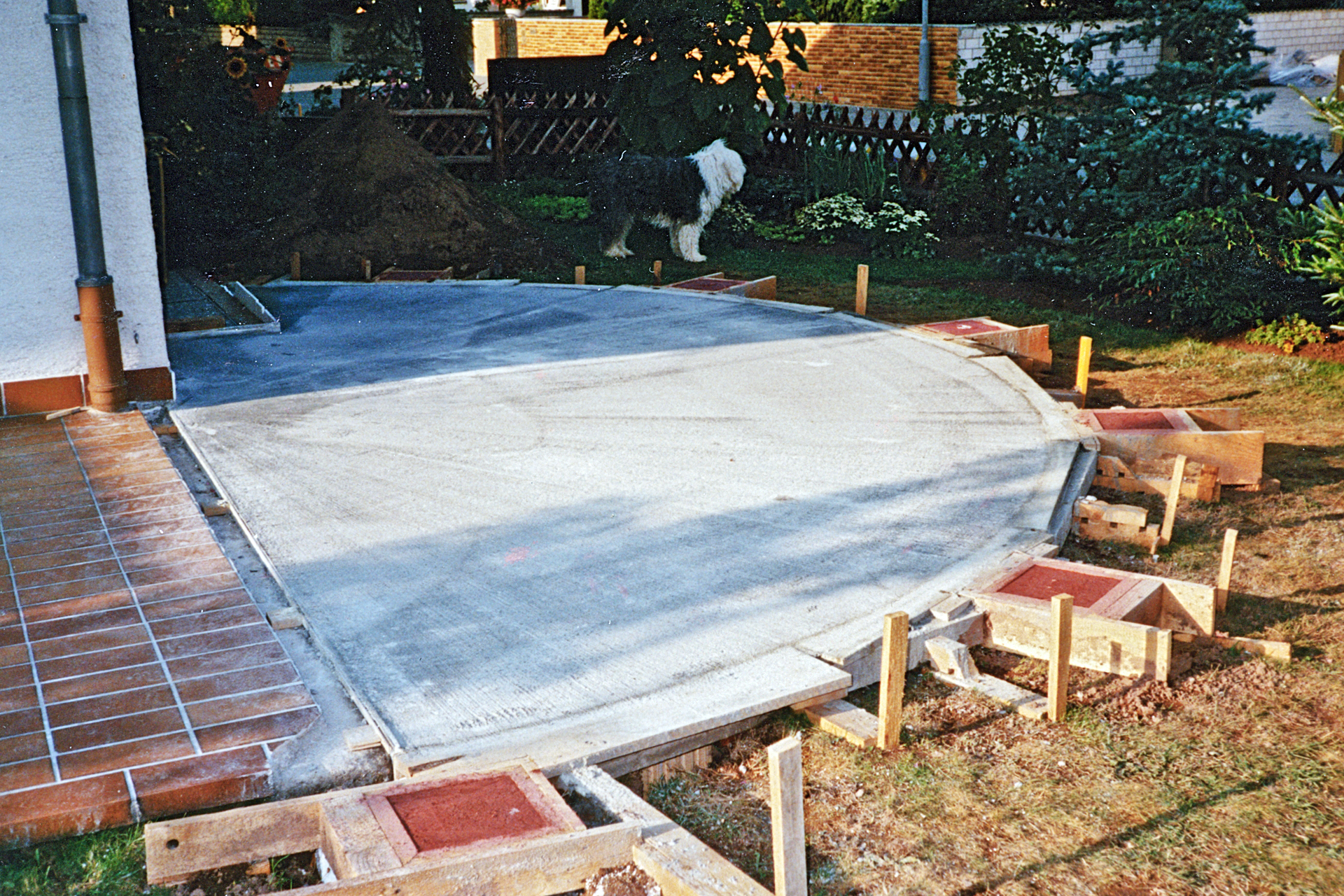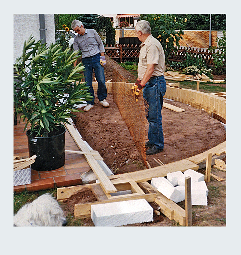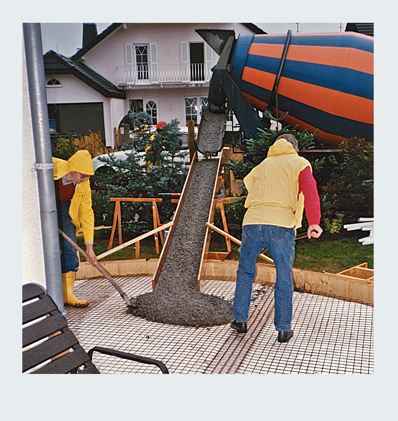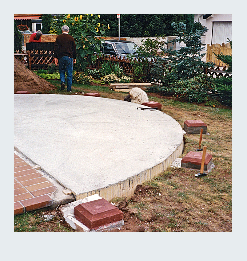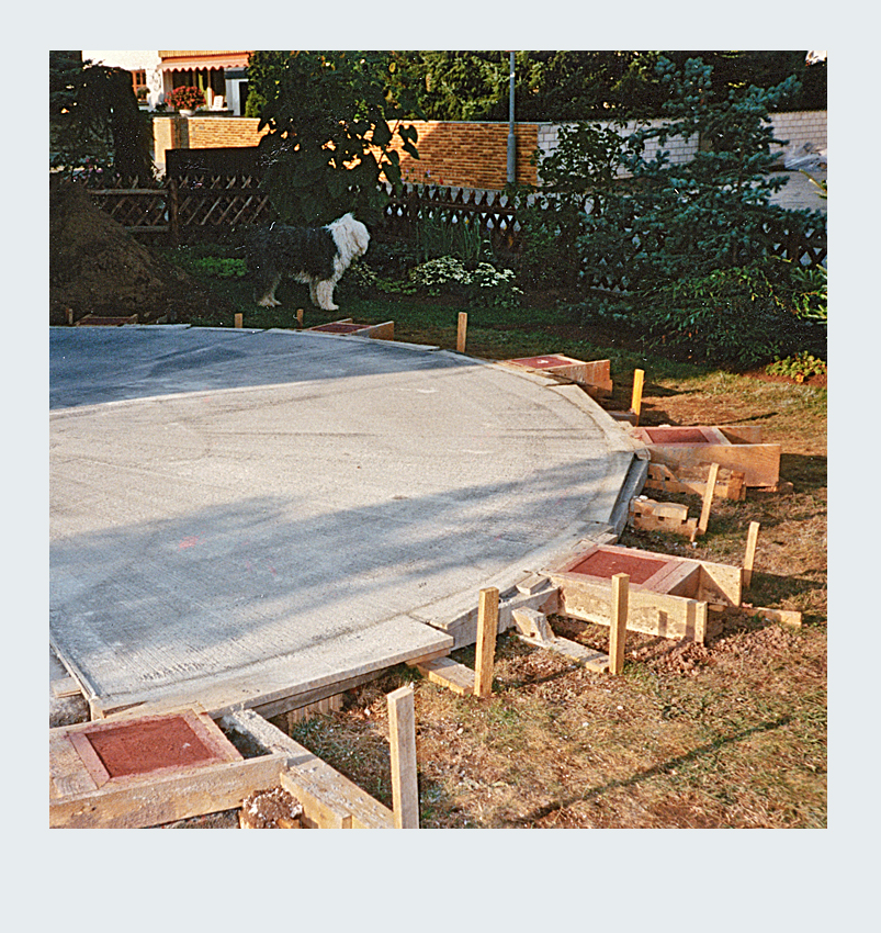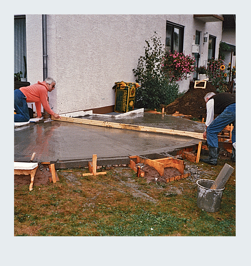 Parallel zur Umgestaltung unseres Vorgartens nahmen wir ein weiteres spannendes Projekt in Angriff: die Erweiterung unserer Terrasse. Nach sorgfältiger Planung entschieden wir uns, die Terrassenfläche halbkreisförmig auf der linken Seite des Hauses zu erweitern. Die Umsetzung begann mit dem sorgfältigen Abstecken der zusätzlichen Fläche. Der Erdaushub für die Randfundamente erfolgte in mühevoller Handarbeit. Da die zusätzliche Terrassenfläche höher liegen sollte als der vorhandene Boden, entfernten wir lediglich die Grasnarbe. Gleichzeitig legten wir die Fundamente für die Tragsäulen der Pergola an, um später eine stabile Konstruktion zu gewährleisten. Die Verschalung der halbrunden Fläche sowie die Säulenfundamente bauten wir aus Holz. Unter der neuen Betonfläche legten wir Styroporplatten und Metall-Armierungsmatten aus, um einen sauberen und festen Untergrund zu schaffen. Schließlich wurde die gesamte Fläche mit hochwertigem Fertigbeton ausgegossen und sorgfältig nachbearbeitet.