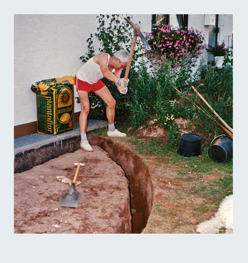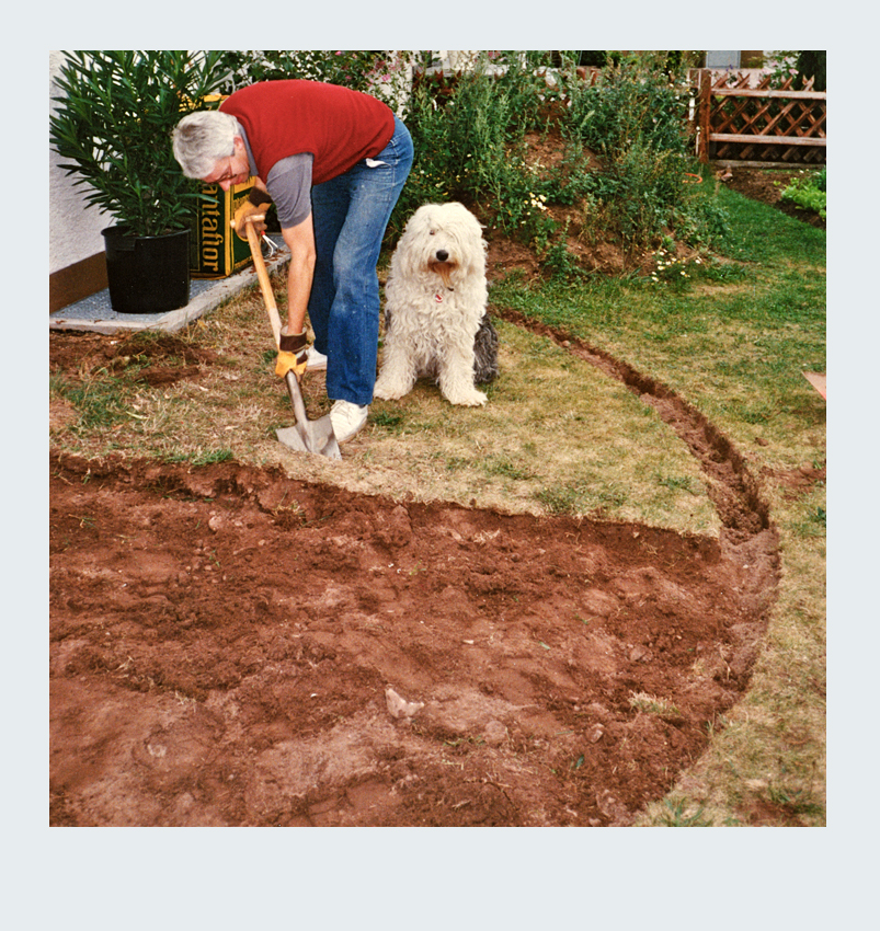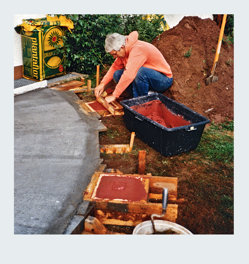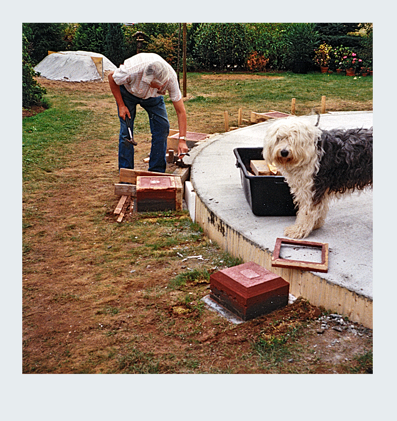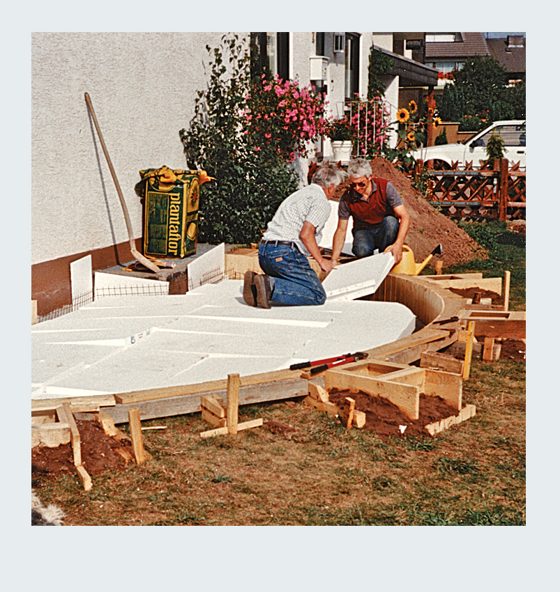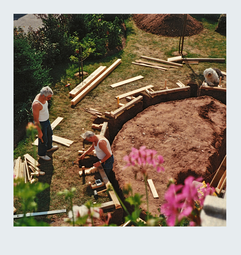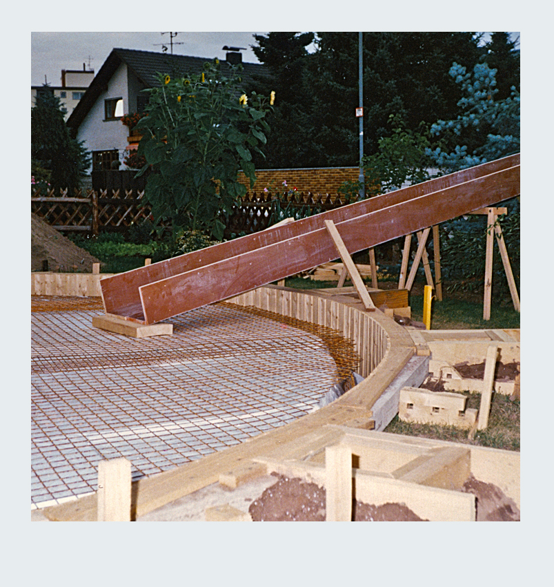 Parallel zur Umgestaltung unseres Vorgartens nahmen wir ein weiteres spannendes Projekt in Angriff: die Erweiterung unserer Terrasse. Nach sorgfältiger Planung entschieden wir uns, die Terrassenfläche halbkreisförmig auf der linken Seite des Hauses zu erweitern. Die Umsetzung begann mit dem sorgfältigen Abstecken der zusätzlichen Fläche. Der Erdaushub für die Randfundamente erfolgte in mühevoller Handarbeit. Da die zusätzliche Terrassenfläche höher liegen sollte als der vorhandene Boden, entfernten wir lediglich die Grasnarbe. Gleichzeitig legten wir die Fundamente für die Tragsäulen der Pergola an, um später eine stabile Konstruktion zu gewährleisten. Die Verschalung der halbrunden Fläche sowie die Säulenfundamente bauten wir aus Holz. Unter der neuen Betonfläche legten wir Styroporplatten und Metall-Armierungsmatten aus, um einen sauberen und festen Untergrund zu schaffen. Schließlich wurde die gesamte Fläche mit hochwertigem Fertigbeton ausgegossen und sorgfältig nachbearbeitet.