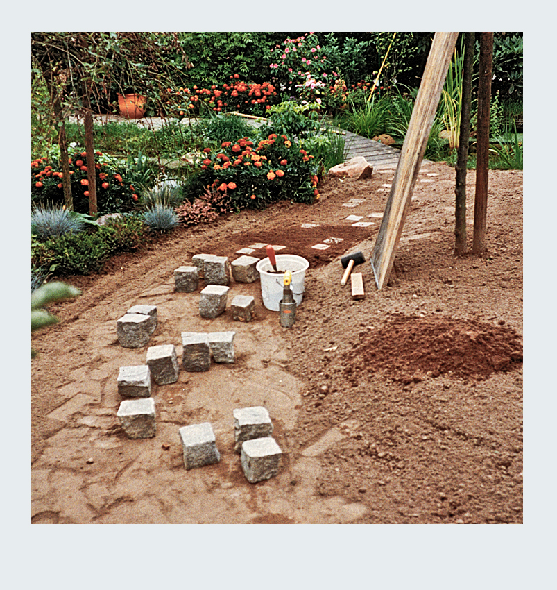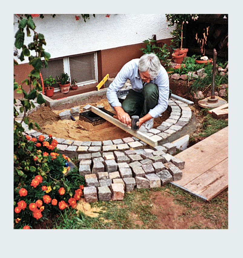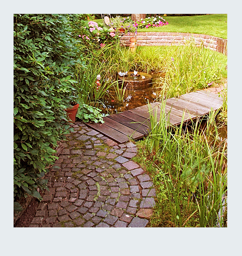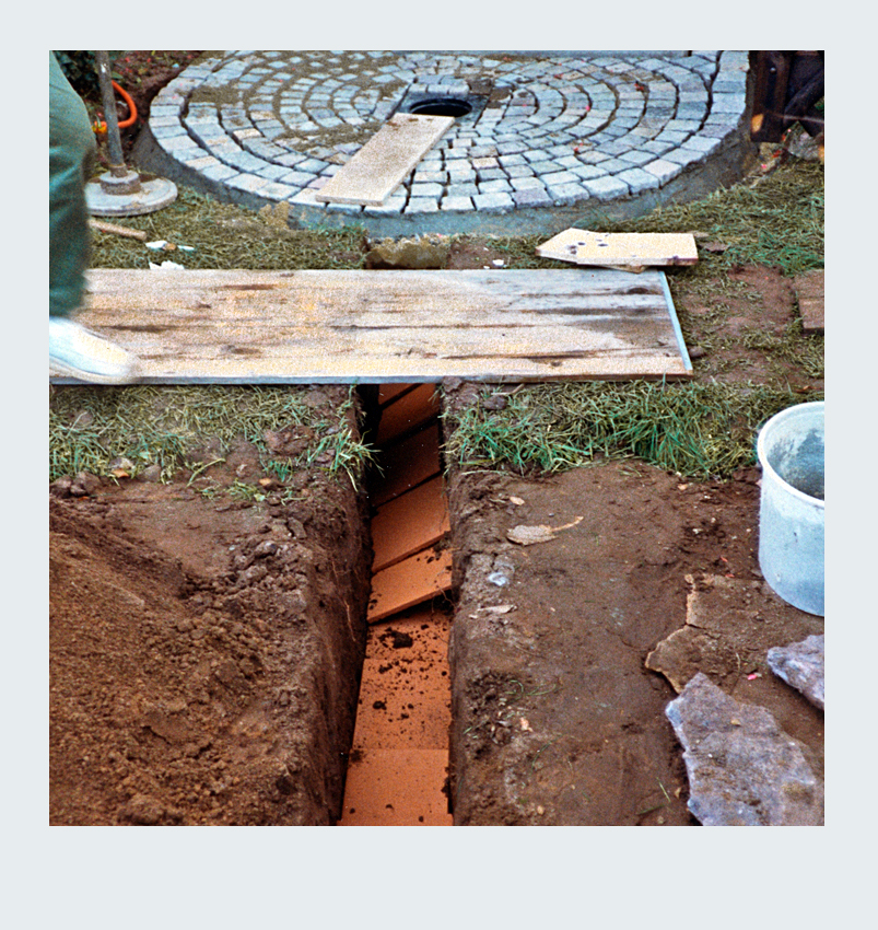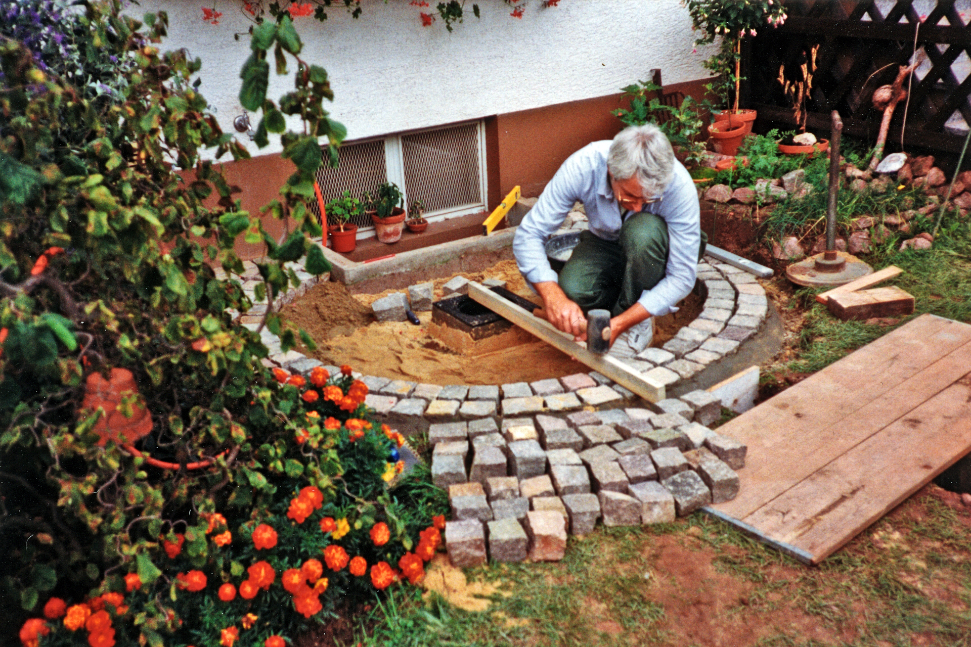 Wir wollten einen sauberen und funktionellen Platz für die tägliche Reinigung unseres Bobtails am Außenwasserhahn schaffen. Dabei war uns nicht nur die Funktionalität, sondern auch eine optisch ansprechende Gestaltung wichtig. Da unser Bobtail nur mit warmem Wasser richtig sauber wird, haben wir den Außenwasserhahn an das Warmwassersystem angeschlossen und mit einer Thermostatsteuerung versehen. Für das Abwasser war damals ein Kanalanschluss an dieser Stelle nicht möglich, deshalb haben wir einen Bodenablauf mit angeschlossener Sickergrube eingebaut. Die Bodenfläche haben wir mit viel Aufwand und Präzision mit Pflastersteinen gestaltet, um eine praktische, robuste und ästhetische Lösung zu schaffen. Diese Art der Pflasterung gefiel uns damals so gut, dass wir sie später auch für die Gartenwege und den Sitzplatz am Teich verwendeten.