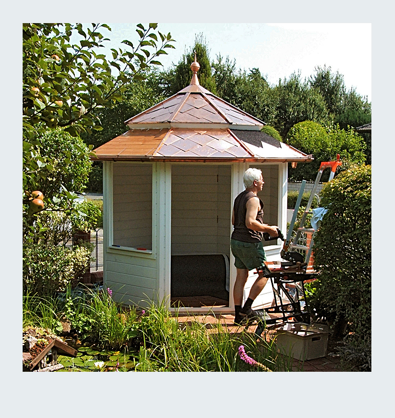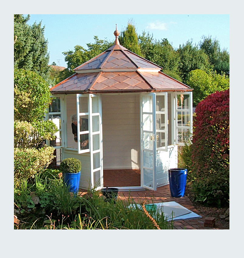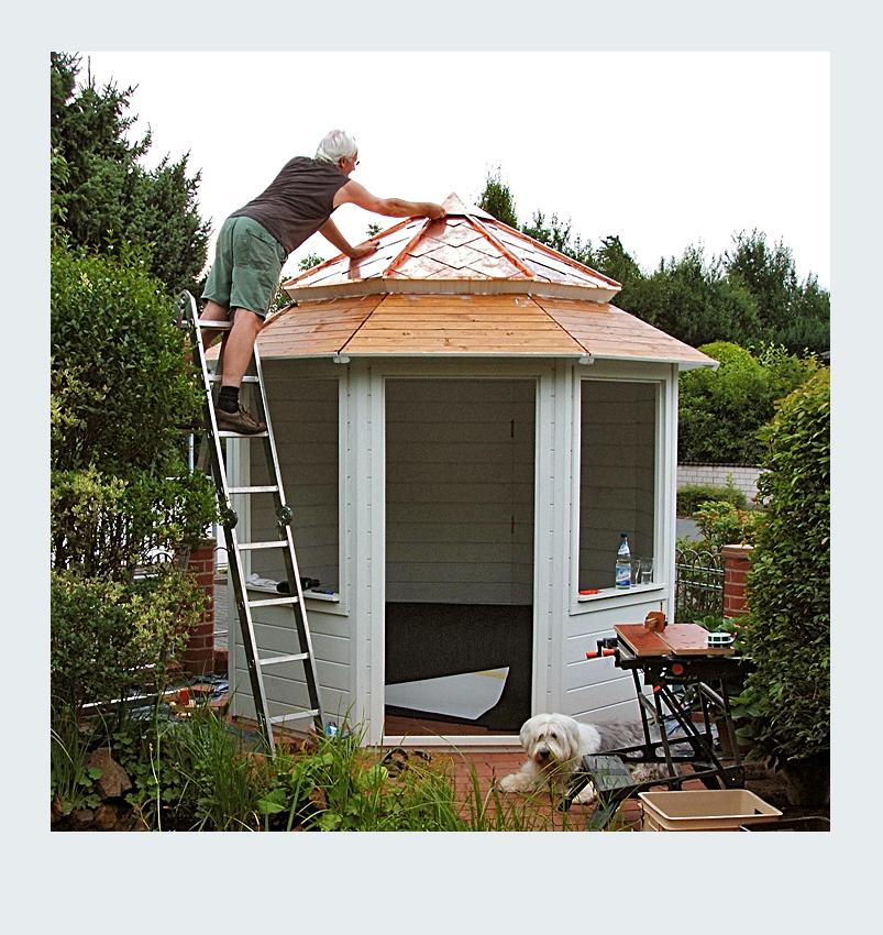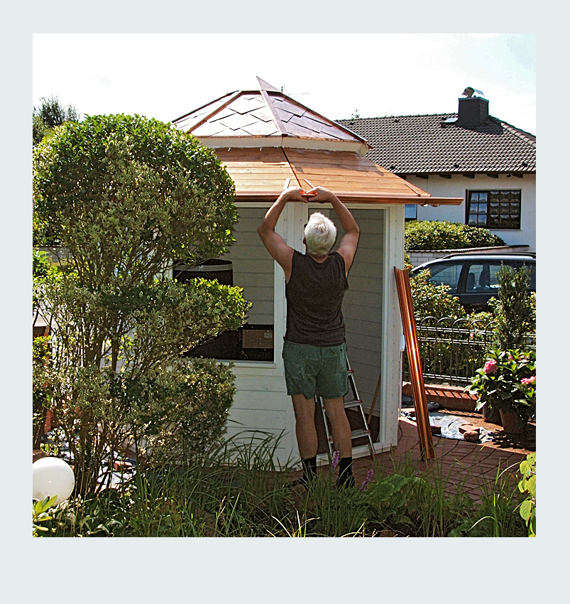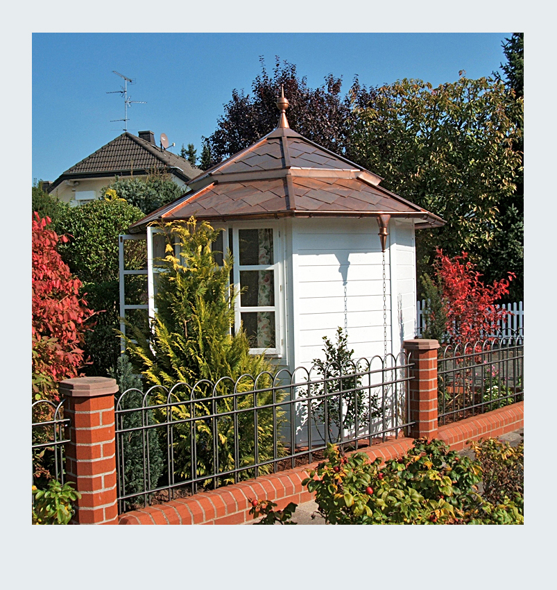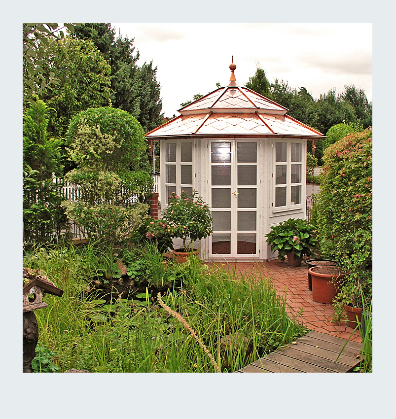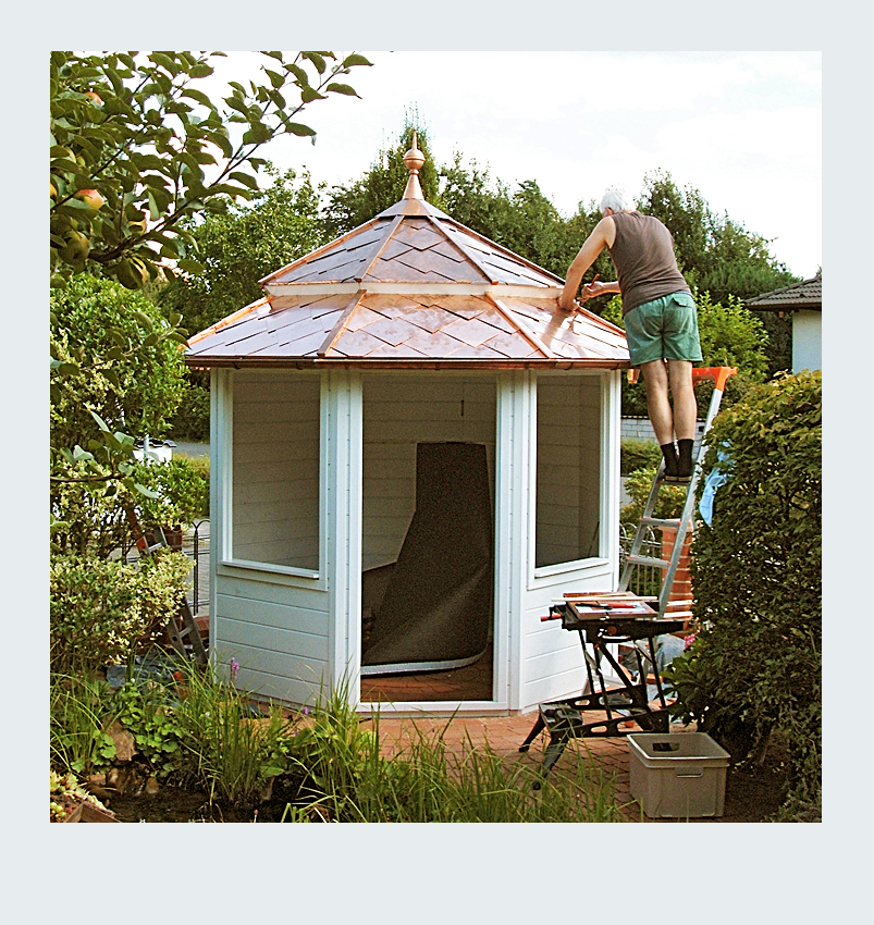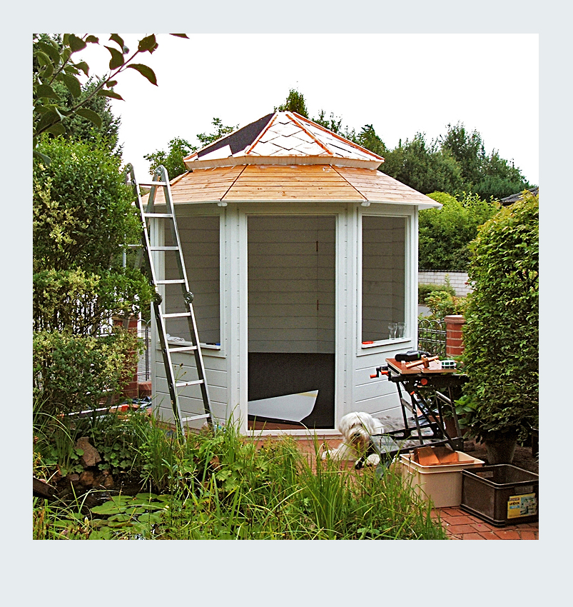 Das Projekt erforderte einige Veränderungen in unserem Garten. Um Platz für den Pavillon zu schaffen, entfernten wir die Bank am Teich und die die dahinterstehenden Bäume. Die Teichform wurde leicht angepasst, damit der Pavillon harmonisch in den Garten integriert werden konnte. Die Bodenfläche für den Pavillons bekam eine 20cm dicke Bodenplatte aus Beton. Der Unterbau des Pavillons wurde in Eigenleistung gepflastert, um einen stabilen Untergrund zu schaffen. Auch der angrenzende Weg zur Teichbrücke wurde neu angelegt und perfekt an die bestehenden Gartenwege angepasst. Durch diese Veränderungen fügt sich der Pavillon sehr gut in das Gesamtbild des Gartens ein. Aus Kostengründen entschieden wir uns, den Pavillon teilweise als Bausatz zu kaufen. Die einzelnen Bauteile haben wir sorgfältig überarbeitet, mehrfach gestrichen und anschließend selbst montiert. Um unserem Pavillon eine individuelle Note zu geben, haben wir einige Elemente wie das abgestufte Kupferdach mit Regenrinne, die beiden Fenster, die Tür und eine halbrunde Sitzbank für den Innenraum selbst entworfen und angefertigt. Das Ergebnis ist ein einzigartiger Blickfang, der nicht nur ein Highlight in unserem Garten ist, sondern auch ein wunderbarer Ort zum entspannen.