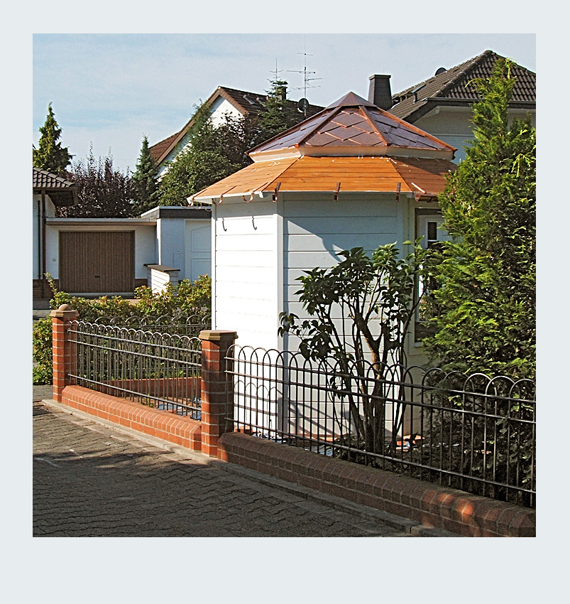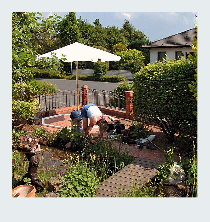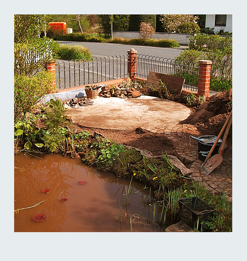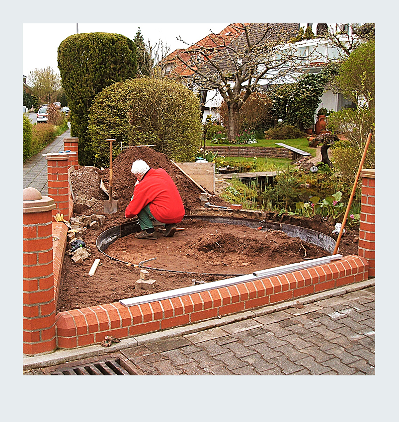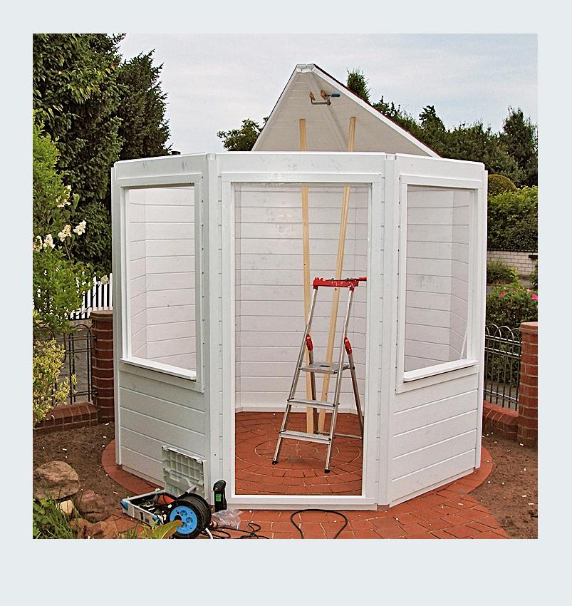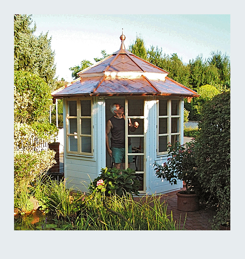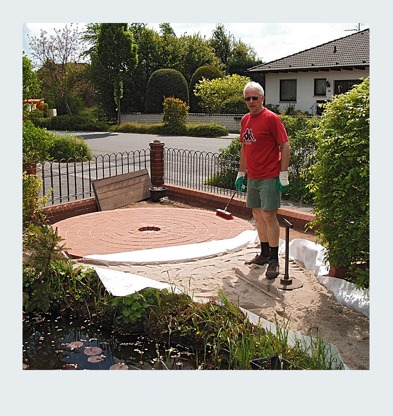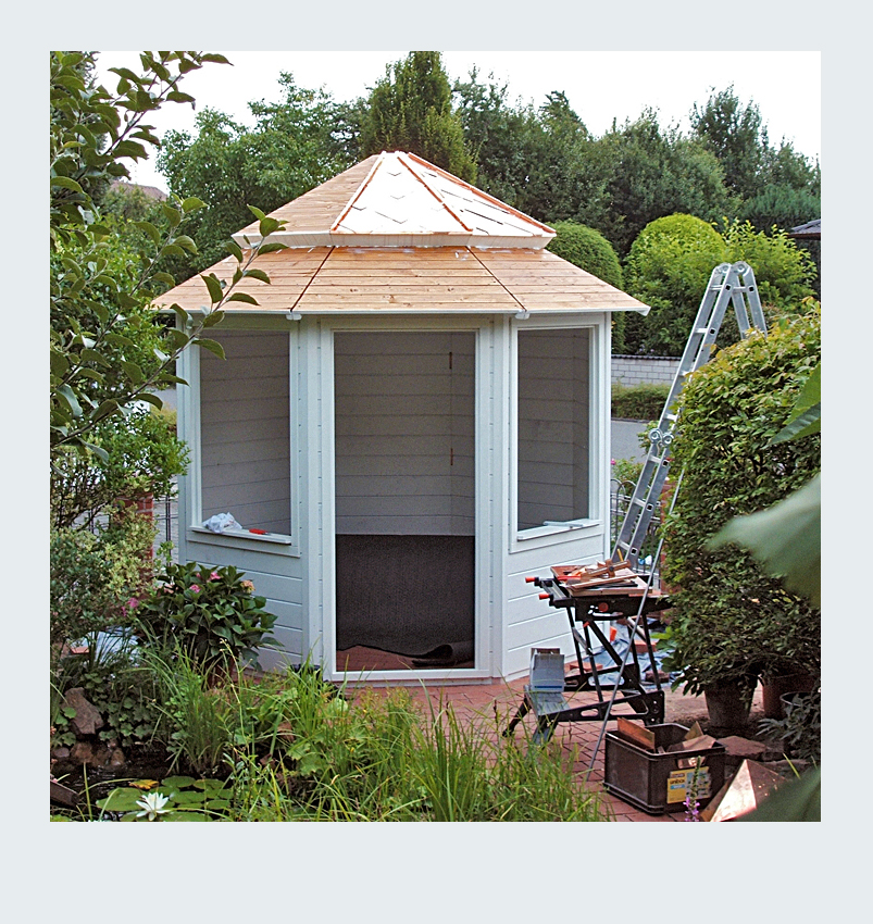 Das Projekt erforderte einige Veränderungen in unserem Garten. Um Platz für den Pavillon zu schaffen, entfernten wir die Bank am Teich und die die dahinterstehenden Bäume. Die Teichform wurde leicht angepasst, damit der Pavillon harmonisch in den Garten integriert werden konnte. Die Bodenfläche für den Pavillons bekam eine 20cm dicke Bodenplatte aus Beton. Der Unterbau des Pavillons wurde in Eigenleistung gepflastert, um einen stabilen Untergrund zu schaffen. Auch der angrenzende Weg zur Teichbrücke wurde neu angelegt und perfekt an die bestehenden Gartenwege angepasst. Durch diese Veränderungen fügt sich der Pavillon sehr gut in das Gesamtbild des Gartens ein. Aus Kostengründen entschieden wir uns, den Pavillon teilweise als Bausatz zu kaufen. Die einzelnen Bauteile haben wir sorgfältig überarbeitet, mehrfach gestrichen und anschließend selbst montiert. Um unserem Pavillon eine individuelle Note zu geben, haben wir einige Elemente wie das abgestufte Kupferdach mit Regenrinne, die beiden Fenster, die Tür und eine halbrunde Sitzbank für den Innenraum selbst entworfen und angefertigt. Das Ergebnis ist ein einzigartiger Blickfang, der nicht nur ein Highlight in unserem Garten ist, sondern auch ein wunderbarer Ort zum entspannen.
