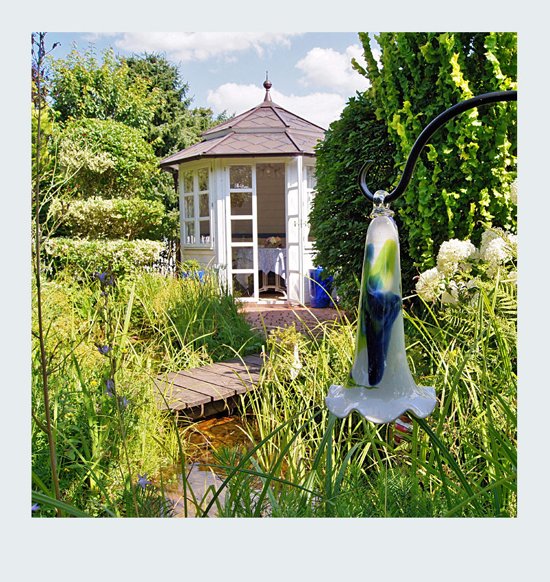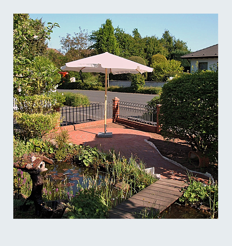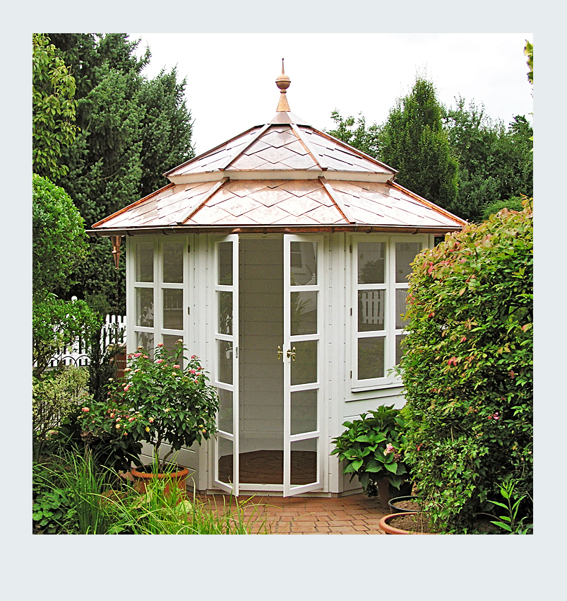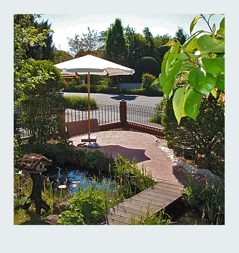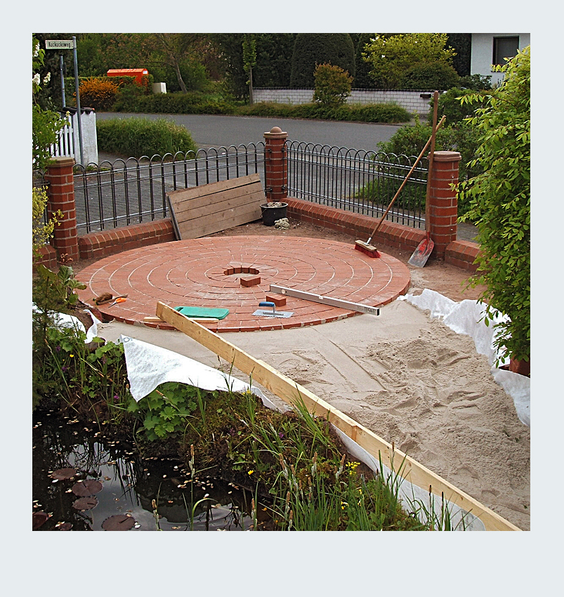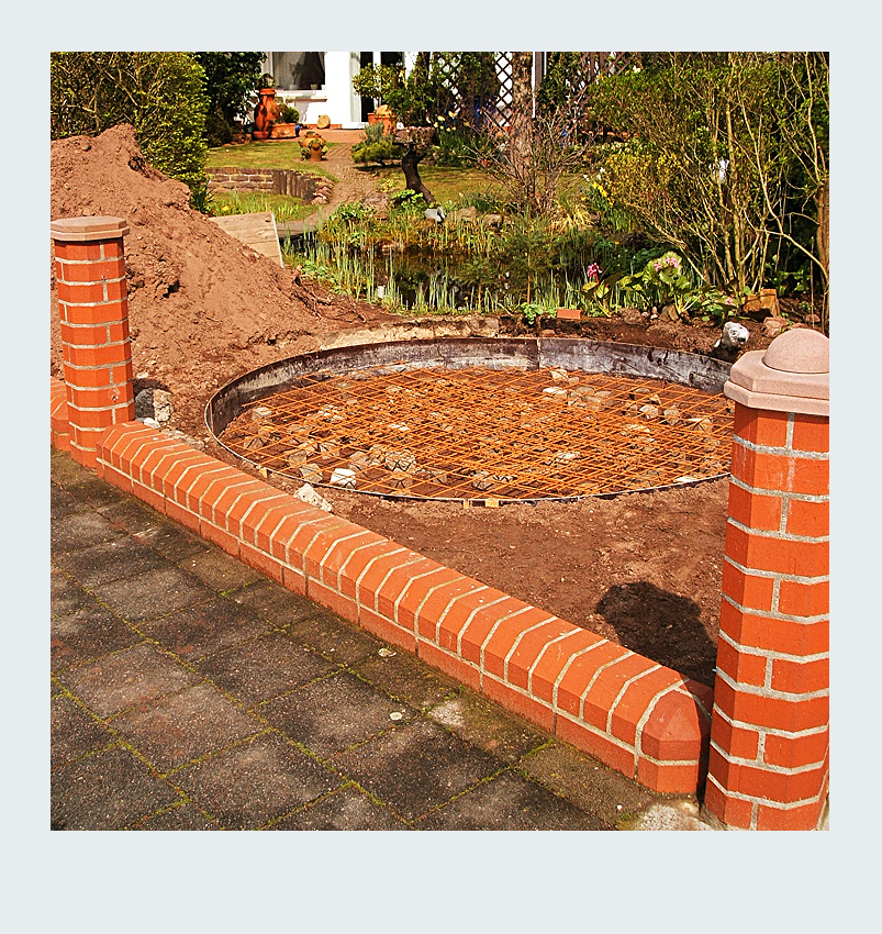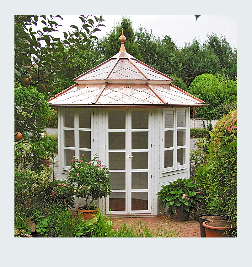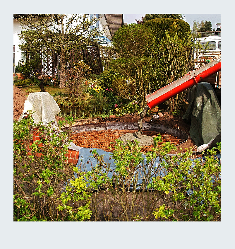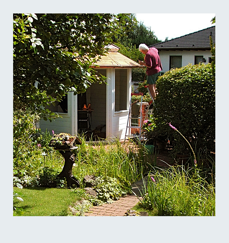 Das Projekt erforderte einige Veränderungen in unserem Garten. Um Platz für den Pavillon zu schaffen, entfernten wir die Bank am Teich und die die dahinterstehenden Bäume. Die Teichform wurde leicht angepasst, damit der Pavillon harmonisch in den Garten integriert werden konnte. Die Bodenfläche für den Pavillons bekam eine 20cm dicke Bodenplatte aus Beton. Der Unterbau des Pavillons wurde in Eigenleistung gepflastert, um einen stabilen Untergrund zu schaffen. Auch der angrenzende Weg zur Teichbrücke wurde neu angelegt und perfekt an die bestehenden Gartenwege angepasst. Durch diese Veränderungen fügt sich der Pavillon sehr gut in das Gesamtbild des Gartens ein. Aus Kostengründen entschieden wir uns, den Pavillon teilweise als Bausatz zu kaufen. Die einzelnen Bauteile haben wir sorgfältig überarbeitet, mehrfach gestrichen und anschließend selbst montiert. Um unserem Pavillon eine individuelle Note zu geben, haben wir einige Elemente wie das abgestufte Kupferdach mit Regenrinne, die beiden Fenster, die Tür und eine halbrunde Sitzbank für den Innenraum selbst entworfen und angefertigt. Das Ergebnis ist ein einzigartiger Blickfang, der nicht nur ein Highlight in unserem Garten ist, sondern auch ein wunderbarer Ort zum entspannen.