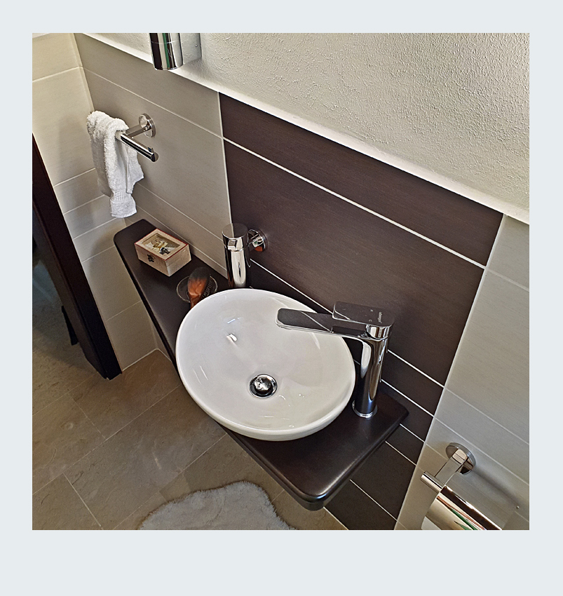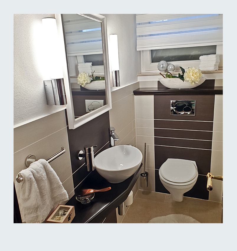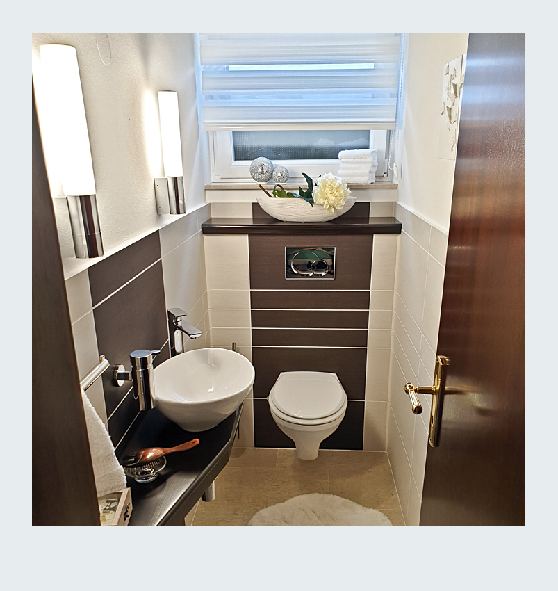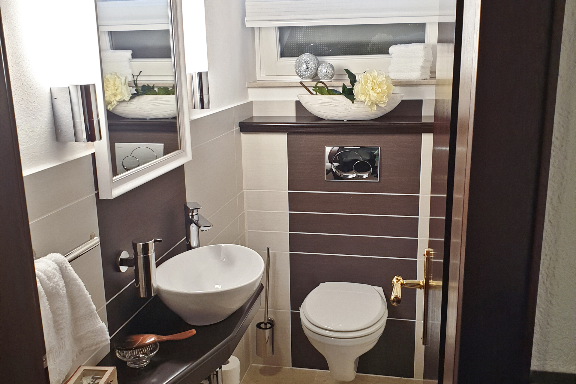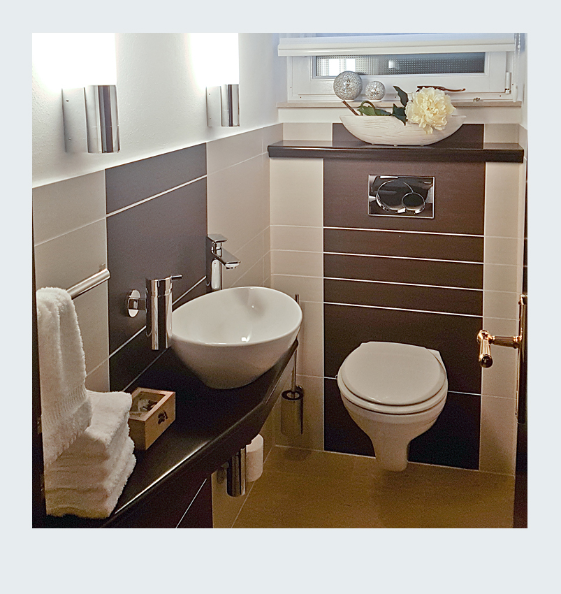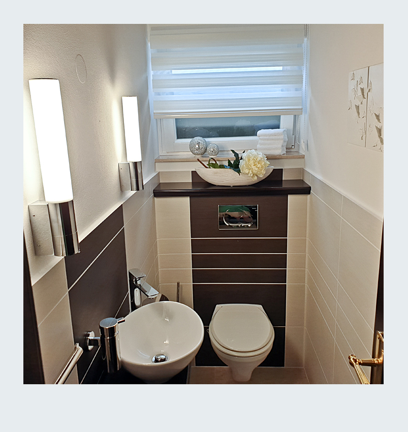 Das in die Jahre gekommene Gäste-WC erstrahlt nach einer Komplettsanierung in neuem Glanz. Von der Planung bis zur Ausführung haben wir alle Arbeiten selbst ausgeführt, um ein Ergebnis zu erzielen, das genau unseren Vorstellungen entspricht. Unser Ziel war es, eine frische und zeitgemäße Atmosphäre zu schaffen. Dazu wurden die alten Fliesen und Sanitärelemente entfernt und der Wandputz sorgfältig ausgebessert. Neue, moderne Fliesen haben wir verlegt. Ein Highlight ist der maßgefertigte Unterbau für das Waschbecken und die Ablage am Fenster, die wir aus dunkel gebeiztem Buchenholz in aufwendiger Handarbeit selbst angefertigt haben. Die Sanitärelemente wie WC und Waschbecken wurden durch moderne Modelle ersetzt, ergänzt durch moderne Armaturen, die Funktionalität und Design perfekt vereinen. Ein elegantes Doppelrollo am Fenster rundet das Gesamtbild harmonisch ab. Entstanden ist ein Gäste-WC, das modernes Design mit hoher Funktionalität verbindet.