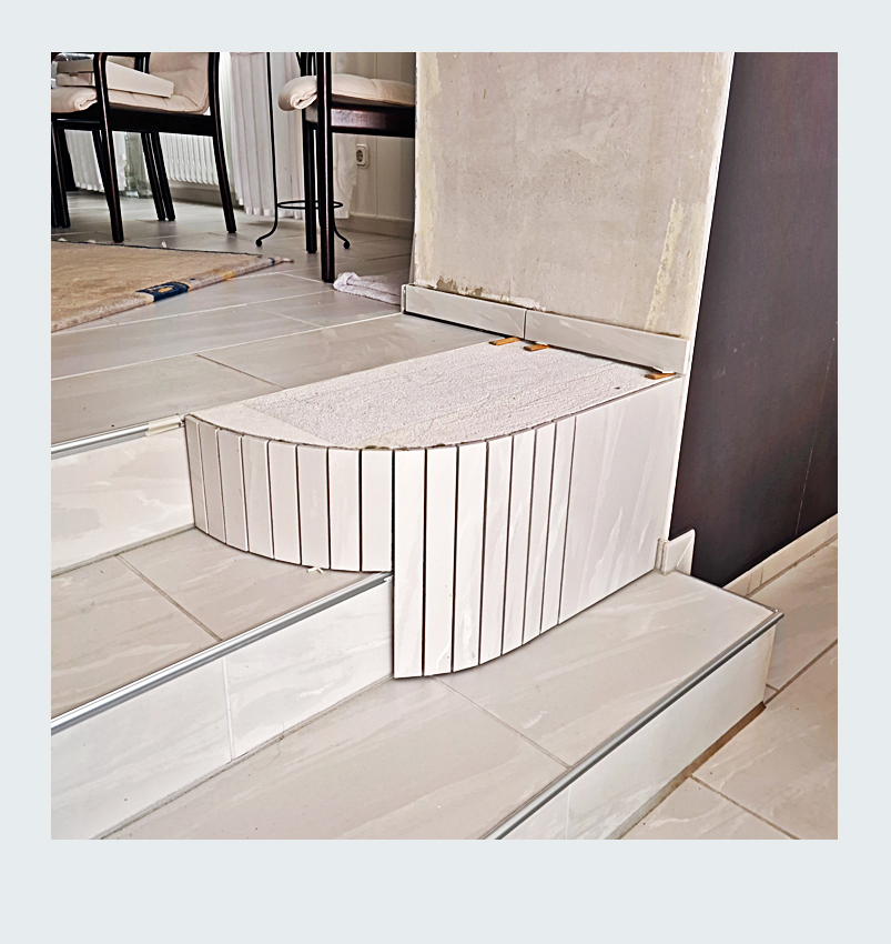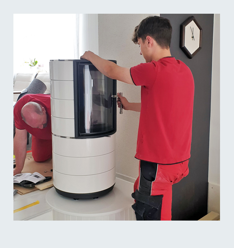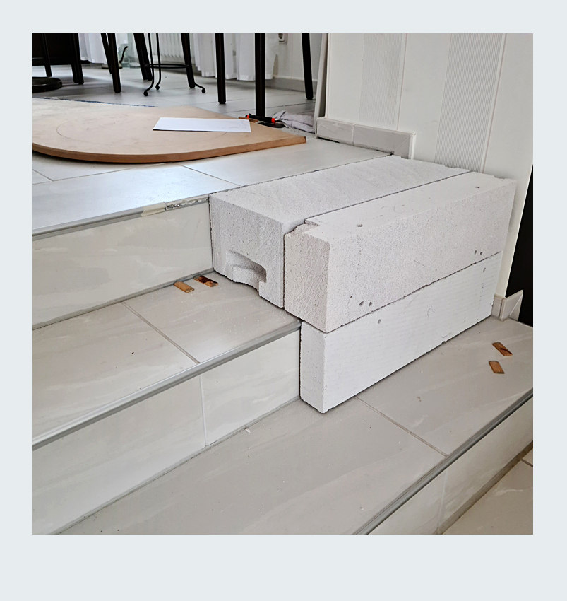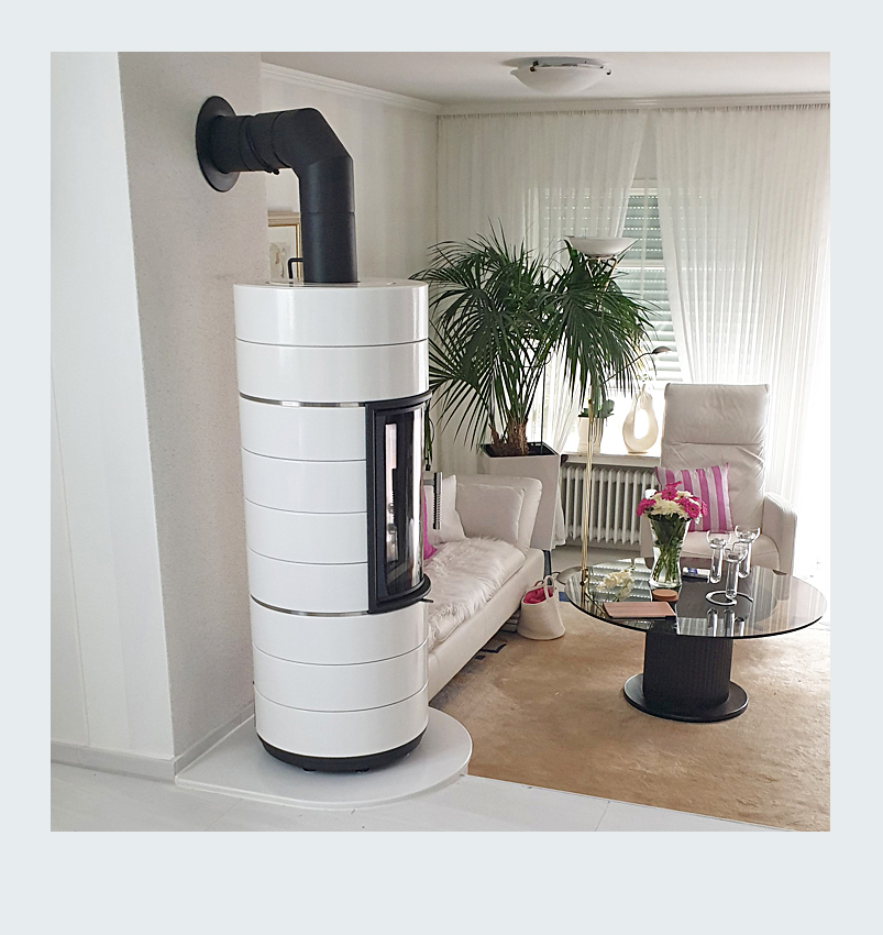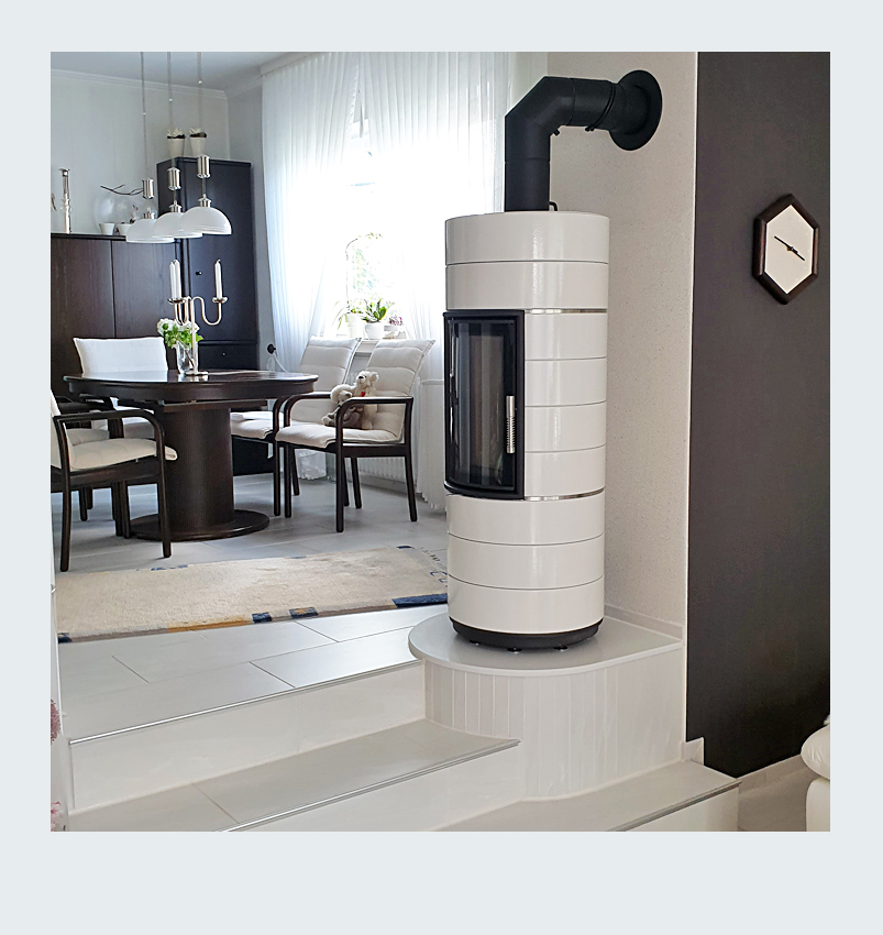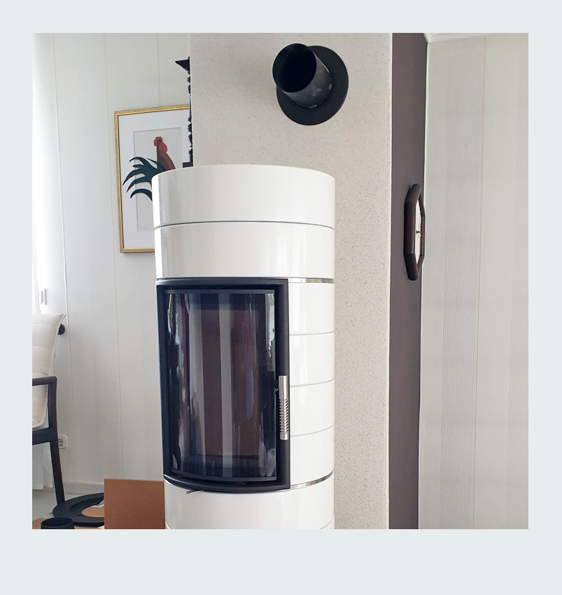 Nach langer Suche haben wir den idealen Platz für unseren Holz-Speicherofen gefunden. Für die Aufstellung des Speicherofens haben wir die gesamte Projektplanung und Abwicklung selbst übernommen, um eine Lösung zu schaffen, die sowohl funktional als auch gestalterisch überzeugt. Der drehbare Speicherofen sollte optimal zwischen Ess- und Wohnzimmer auf der Treppe platziert werden. Die Verlegung des Kaminzuges für die Heizung und die erforderliche Kaminvorbereitung für den Speicherofen wurden von einer Fachfirma ausgeführt. Das Treppenpodest für den Speicherofen haben wir in Eigenleistung erstellt. Für den über 600 kg schweren Speicherofen bauten wir ein massives Podest aus Ytong-Steinen, das direkt in die Treppe integriert wurde. Für die halbrunde Seitenverkleidung wurden noch vorhandene Treppenfliesen passend zugeschnitten und auf den Podestunterbau geklebt. Als Podestabdeckung wurde eine halbrunde Marmorplatte nach Maß angefertigt und passgenau montiert. Vor der Ofenmontage war eine Kernbohrung erforderlich, um das Ofenrohr an den Kaminzug anzuschließen. Die Wand hinter dem Speicherofen haben wir mit einem dekorativen Buntsteinputz versehen, um dem Ofen eine feuersichere Umgebung zu bieten. Die aufwendige Montage und den Anschluss des runden, weißen und drehbaren Speicherofens wurden von einer Fachfirma durchgeführt. Das Ergebnis ist eine funktionale und optisch ansprechende Lösung, die sich perfekt in den Wohnraum einfügt.