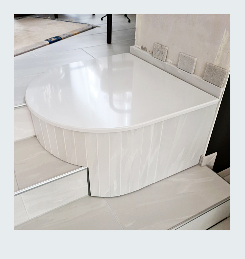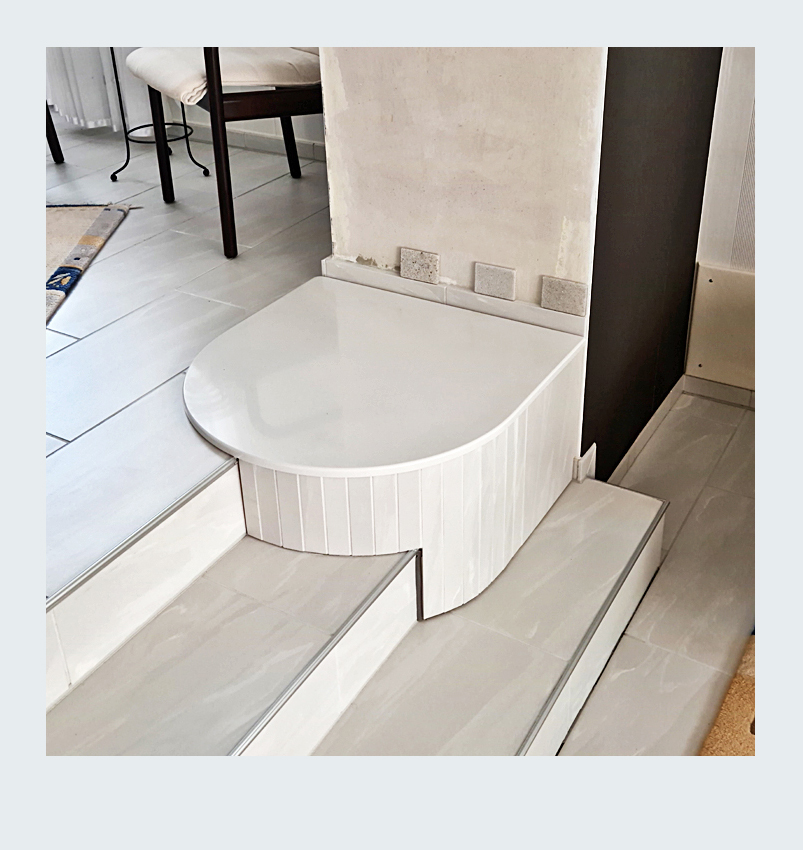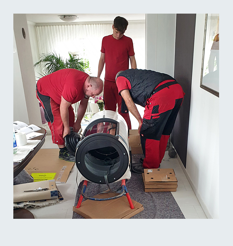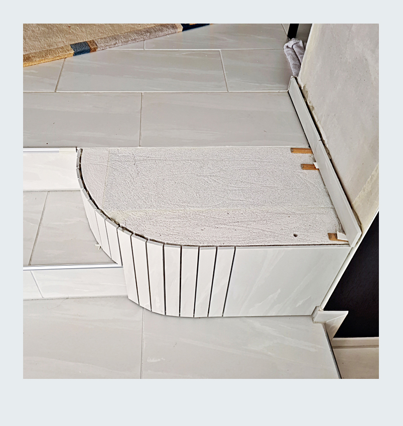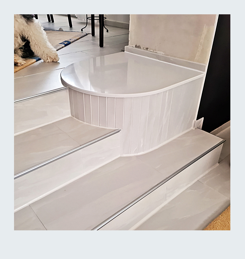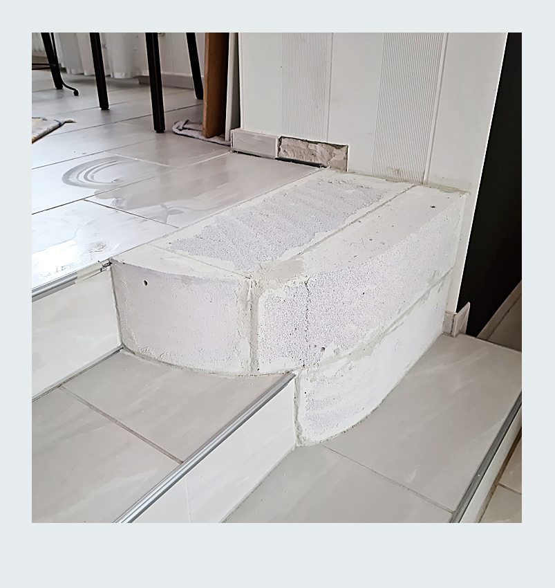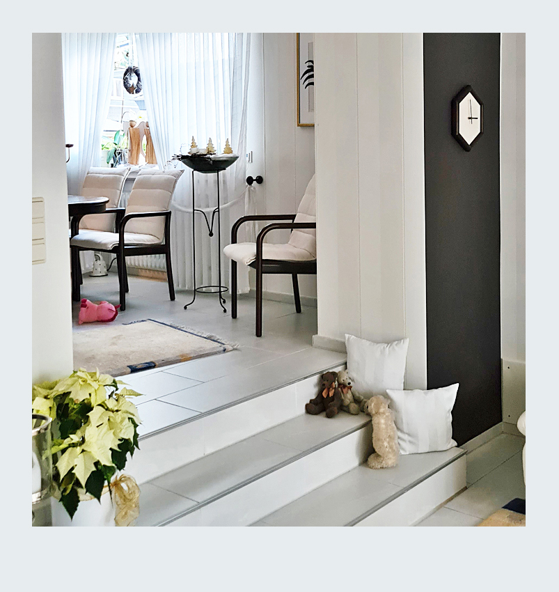 Nach langer Suche haben wir den idealen Platz für unseren Holz-Speicherofen gefunden. Für die Aufstellung des Speicherofens haben wir die gesamte Projektplanung und Abwicklung selbst übernommen, um eine Lösung zu schaffen, die sowohl funktional als auch gestalterisch überzeugt. Der drehbare Speicherofen sollte optimal zwischen Ess- und Wohnzimmer auf der Treppe platziert werden. Die Verlegung des Kaminzuges für die Heizung und die erforderliche Kaminvorbereitung für den Speicherofen wurden von einer Fachfirma ausgeführt. Das Treppenpodest für den Speicherofen haben wir in Eigenleistung erstellt. Für den über 600 kg schweren Speicherofen bauten wir ein massives Podest aus Ytong-Steinen, das direkt in die Treppe integriert wurde. Für die halbrunde Seitenverkleidung wurden noch vorhandene Treppenfliesen passend zugeschnitten und auf den Podestunterbau geklebt. Als Podestabdeckung wurde eine halbrunde Marmorplatte nach Maß angefertigt und passgenau montiert. Vor der Ofenmontage war eine Kernbohrung erforderlich, um das Ofenrohr an den Kaminzug anzuschließen. Die Wand hinter dem Speicherofen haben wir mit einem dekorativen Buntsteinputz versehen, um dem Ofen eine feuersichere Umgebung zu bieten. Die aufwendige Montage und den Anschluss des runden, weißen und drehbaren Speicherofens wurden von einer Fachfirma durchgeführt. Das Ergebnis ist eine funktionale und optisch ansprechende Lösung, die sich perfekt in den Wohnraum einfügt.